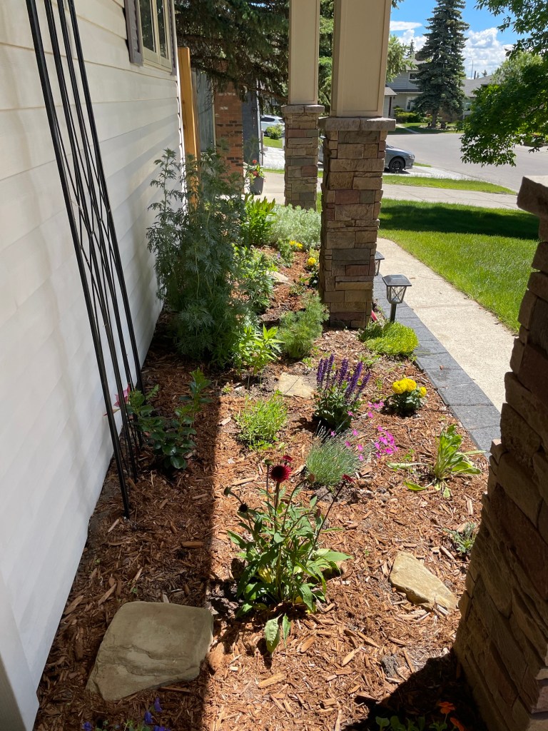 The garden bed in question is south facing, and under a large overhang. It dries out very quickly and doesn’t get any natural water from rain or snowfall because it’s sheltered by that overhang. After taking a couple garden courses (the UofS soil sciences course is tough, but it’s a gooder!), I realized it needed help. I tried to amend it. I added compost. I mulched (but not enough). I watered it weekly. Still very poor yields. In all honesty, the soil was so clay-like it would have taken years to amend it and get it healthy again. So we bit the bullet and had it dug out. Put in some quality soil, and planted some new drought-tolerant perennials. This is the second summer and most of the perennials have come back and are thriving. Yay!